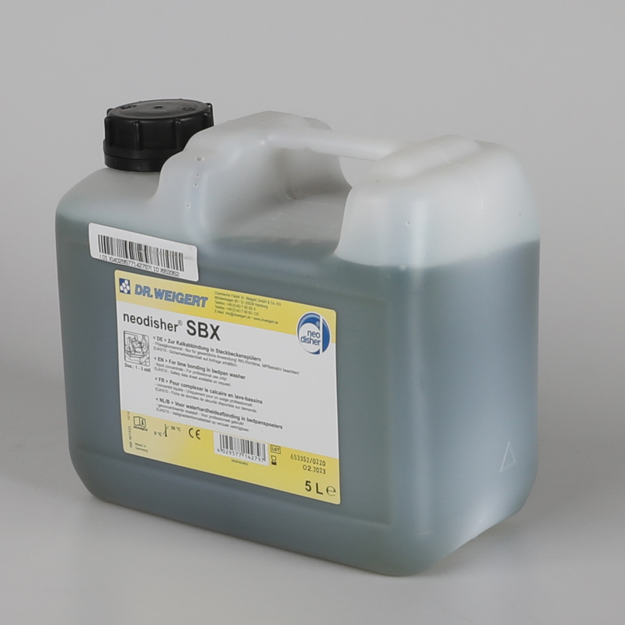 Tekutý čisticí prostředek pro použití v myčkách podložních mís a močových lahví.Balení 5 l