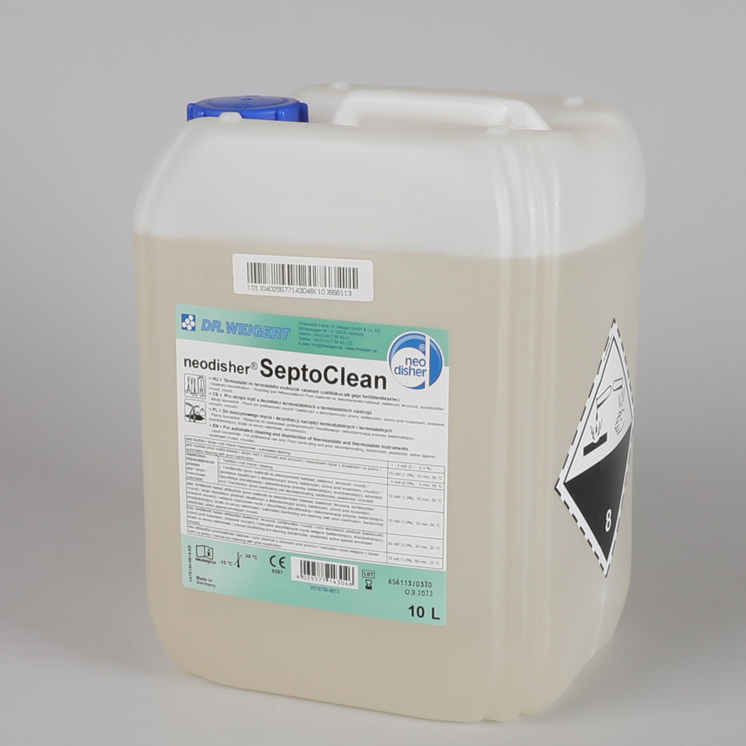 Tekutý alkalický čisticí prostředek s dezinfekčním účinkem pro strojní ošetření zdravotnických prostředků. Neodisher® SeptoClean má spektrum účinnosti baktericidní, mykobaktericidní, fungicidní, virucidní, destabilizující a deaktivující priony.Balení 20 l
